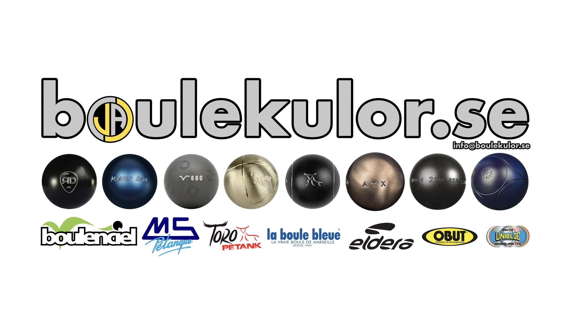 boulekulor.se är generalagent i Sverige för åtta olika fabrikat av bouleklot. Boulenciel, La boule bleue, MS Pétanque, KTK Pétanque, JPF Petanque, TORO Petank, Unibloc och La boule OBUT. Genom dessa fabrikat kan vi utlova absolut bästa kvalité och världsledande tillverkning av bouleklot. Även generalagent för Eldera, en Fransk leverantör av sportkläder och RSport som är en Italiens sportklädes tillverkare. Titta genom sidan, här hittar ni allt inom pétanque.